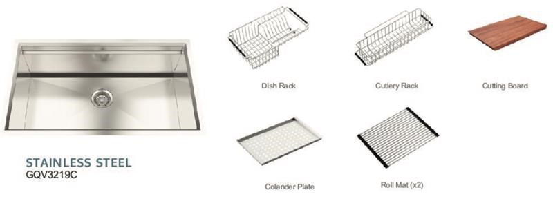 The ultimate kitchen systems solution. This modern large undermount single bowl sink is built with 16 gauge surgical stainless steel. Its design features a flush reveal, satin finish, and a sound-resistant system.It comes with a variety of kitchen essential accessories that can be attached to the sink delivering functionality, more space, and style to your kitchen. Including a flat basket strainer, cutting board, colander plate, dish rack, cutlery rack, and two roll mats. Designed with straight corners maximizing your freedom of movement, it is hand-crafted to perfection.
